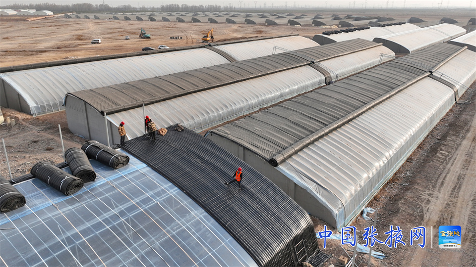 在甘州区巴吉滩万亩零碳戈壁农业园区(一期)建设现场,大批工人和机械正在紧张作业,一座座采用eps空腔保温模块搭建的日光温室已经拔地而起,勾勒出这片昔日荒漠上现代农业的崭新轮廓。