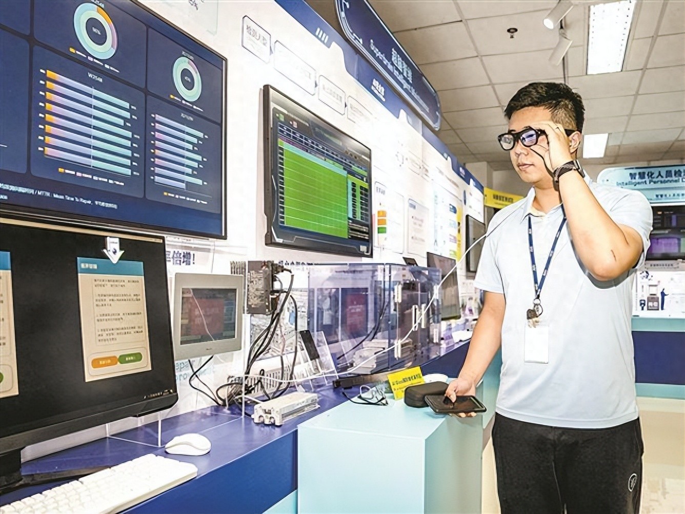 工作人员正在展示AI眼镜如何辅助设备检修。