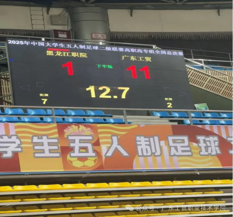 决赛场上,广东工贸职院代表队更是状态神勇。队员们秉持“更快、更高、更强——更团结”的体育精神,充分展现了日常训练的扎实功底:流畅的战术配合撕开对手防线,灵巧的过人技巧创造进攻机会,严密的防守体系筑牢坚固后盾。每一次抢断、每一次射门都凝聚着团队的力量,最终以11:1的悬殊比分完胜对手,成功捧起全国总冠军奖杯,用汗水与拼搏书写了青春荣耀。