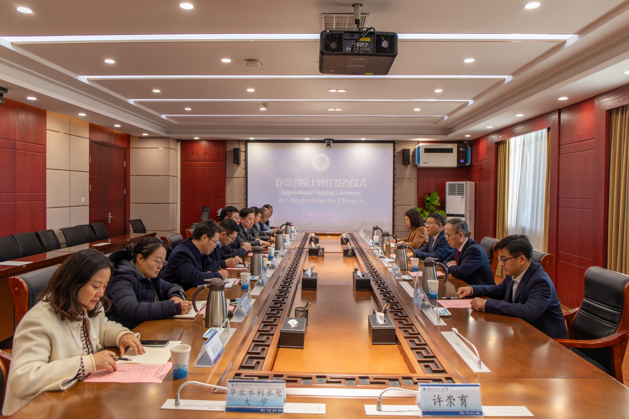 许崇育院士在发言中表达了对全职加盟学校的感谢与期待。他表示,当前我国的水利事业面临着全球变化下严峻的挑战,学校治水安邦的理念以及为国家水利事业做出的杰出贡献与他本人学术理想和报国情怀深度契合。此次回国全职加盟华水,不仅是一次职业的抉择,更是将毕生所学、所研、所思贡献给祖国水利事业的崭新启程。他希望,未来将全身心致力于培养全球视野、创新精神和社会责任感的水利英才,带领团队聚焦前沿领域开展原创性、引领性的科研工作,搭建跨国合作与交流桥梁,积极引进智力资源,助力学校国际化水平和学术声誉进一步提升,与学校共绘发展的崭新蓝图。
