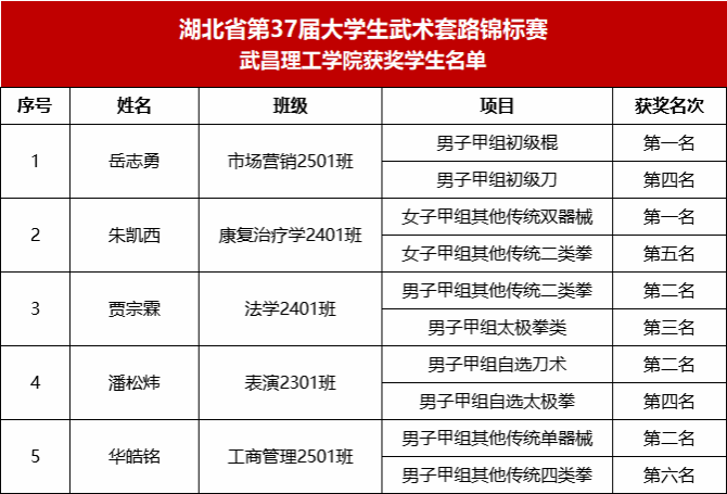 本届赛事由湖北省大学生体育协会主办,吸引了包括武汉大学、华中科技大学、湖北大学在内的20余所高校、300余名运动员参赛。武昌理工学院参赛选手均来自校武术协会,在初级棍、自选刀术、传统双器械等多个项目中发挥稳定、动作扎实,展现了良好的武术功底与竞赛心态,最终在多个项目上取得优异成绩。