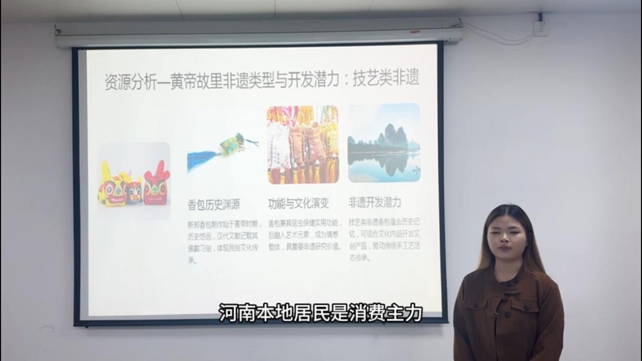 市场价值链:激活非遗的“力”。“非遗要‘活’,必须对接市场。”团队通过分析游客消费数据发现,18-30岁的年轻群体占受访者的93.67%,他们更倾向于“沉浸式体验”和“社交化消费”。基于此,团队提出了“文旅融合+多产业协同”的市场开发路径:一方面,整合黄帝故里景区、具茨山岩画、新郑非遗工坊等资源,打造“黄帝文化一日游”线路,设置“拜祖仪式体验”“剪纸DIY”“香包制作”等沉浸式项目,延长游客停留时间;另一方面,推动非遗与农业、制造业融合,比如将黄帝文化元素融入新郑灰枣包装,开发“黄帝祈福枣礼盒”,或将剪纸技艺应用于服装、文具设计,提升产品的文化附加值。值得一提的是,团队还参考了故宫文创年销售额15亿元的成功经验,建议黄帝故里非遗文创从“纪念品思维”转向“IP思维”,打造具有辨识度的“黄帝IP”系列产品。