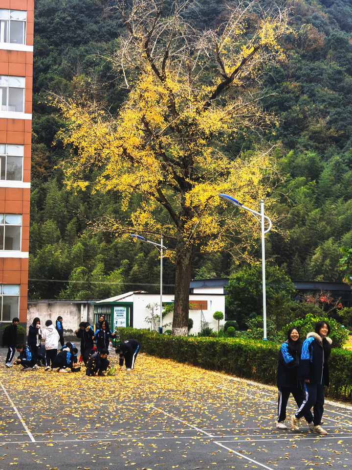这棵古银杏已在四明职高校园矗立一百六十载,粗壮的枝干镌刻着学校的办学历程,金黄的叶片承载着师生的青春记忆。每到深秋,满树金黄与青灰色教学楼相映成趣,阳光穿过枝叶洒下的斑驳光影,为校园铺就了一幅天然的美育画卷。下课铃声响起,学子们便纷纷涌向银杏树下,捡拾起飘落的金叶,或精心挑选完整的叶片夹进课本,或用落叶拼搭创意图案,还有老师举着手机记录下这份秋日限定的美好。指尖触碰叶片脉络的柔软触感,脚下落叶沙沙作响的自然韵律,让同学们在与自然的亲密互动中,感受着色彩、形态与光影的艺术之美。