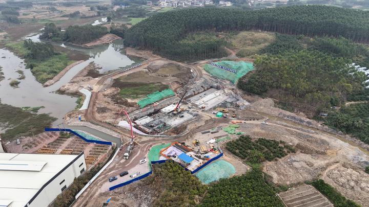 在另一处重大水利工程建设现场——广西来宾市下六甲灌区凉亭引水枢纽,机械轰鸣声此起彼伏。挖掘机挥舞长臂清理基坑,吊机精准吊运建材,工人们各司其职,全力推进大坝挡土墙混凝土浇筑作业。