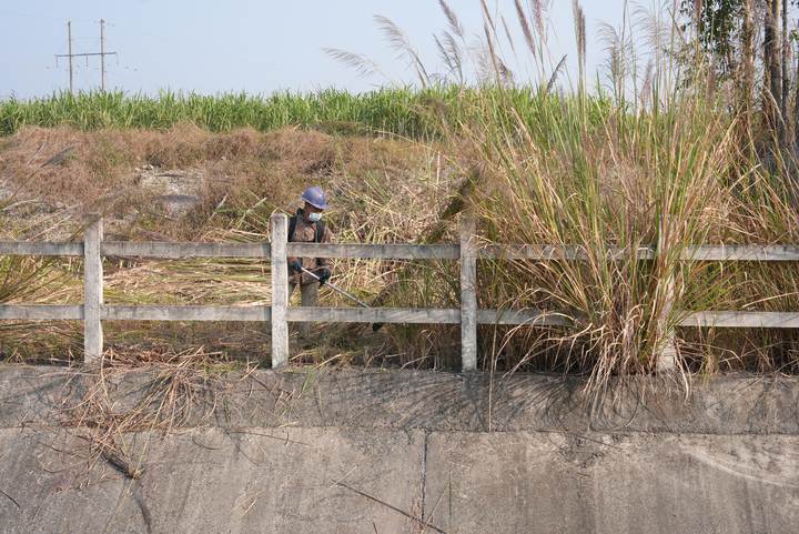 根据2025年度工程维修维护施工安排,桂中治旱乐滩灌区于2025年12月1日已全线停水。在灌区迁江分干渠现场,渠道水位已明显下降,裸露的渠岸成为冬修的主战场。数十名工人手持除草工具,沿着渠道边坡和渠顶道路有序作业,将杂草、落叶等杂物彻底清理干净,为后续的面板维修、伸缩缝处理扫清障碍。