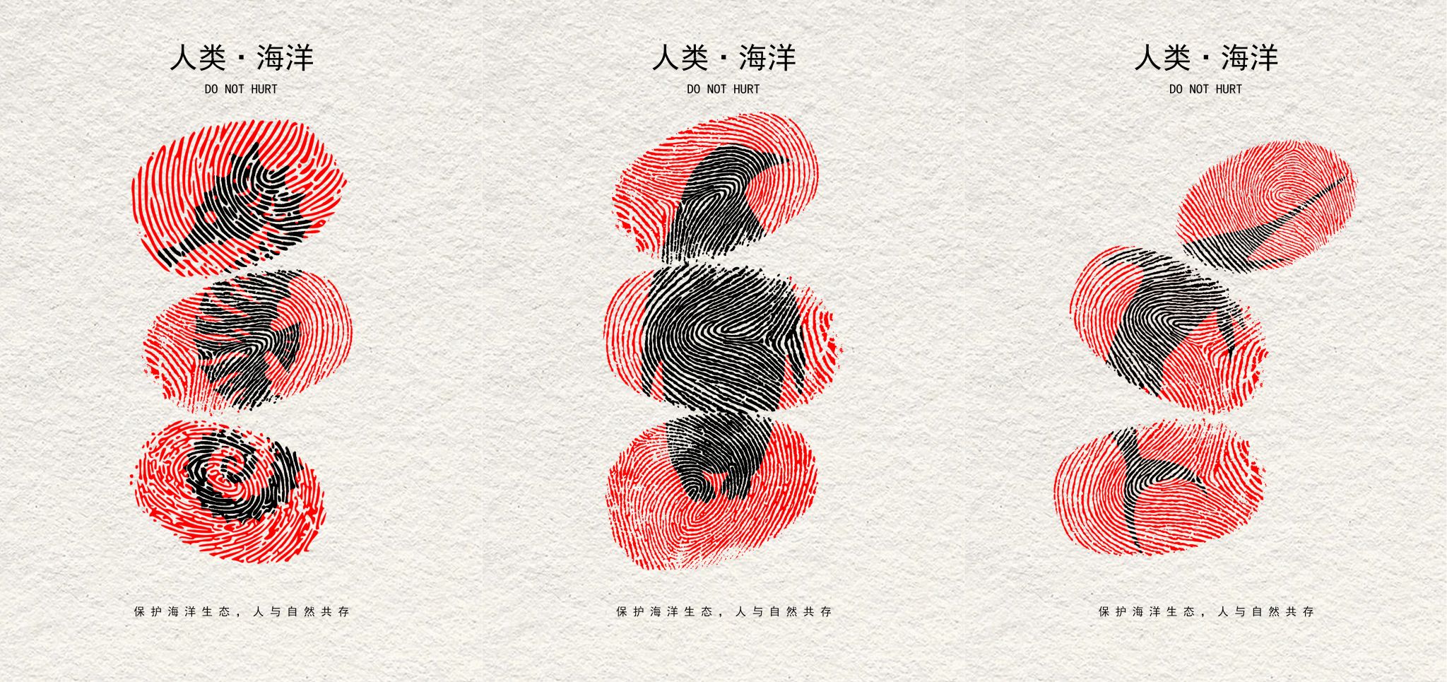 入围的平面作品构思巧妙,寓意深远。其中,由潘益浩、潘汇峰同学创作,韩钰老师指导的《人类·海洋》,以人类指纹与海洋生物剪影相结合,揭示人与自然命运共同体的深刻关系。