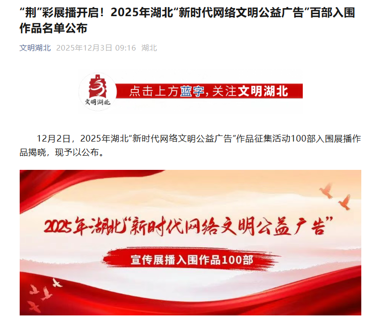 12月2日,2025年湖北“新时代网络文明公益广告”作品征集活动入围展播作品揭晓,100部优秀作品进入展播环节。武昌理工学院在此次活动中表现优异,共有5件作品成功入围,获奖数量与湖北美术学院并列全省高校第一。