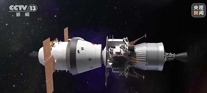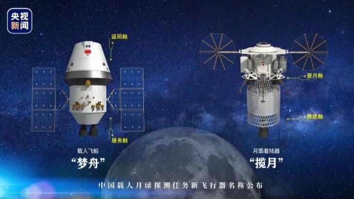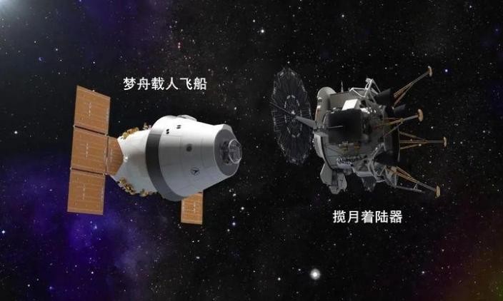 左侧是“梦舟”载人飞船,右侧是“揽月”月面着陆器