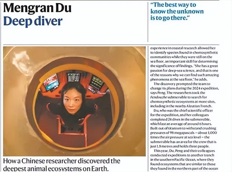 中国科学家杜梦然被《自然》称为“深潜者”。2024年,她和团队搭乘我国自主研发的“奋斗者”号全海深载人潜水器,对西北太平洋的千岛—堪察加海沟和阿留申海沟进行了系统探查。在海平面9000米以下,杜梦然与团队首次发现了一个充满奇异生物的生态系统,也是有记录以来最深的化能合成生态系统,在海洋最底层“见证科学界前所未有的景象”。今年7月,相关研究成果在《自然》杂志发表。