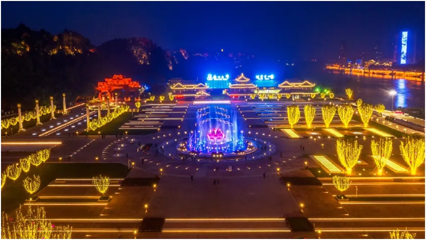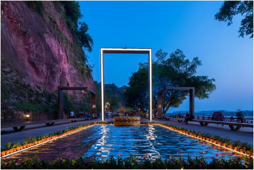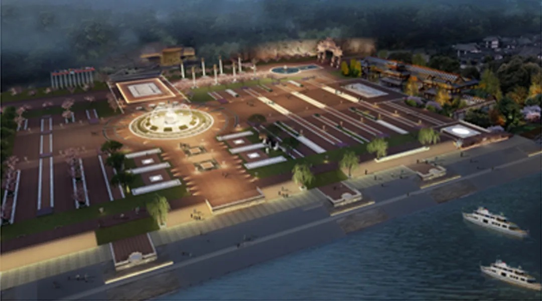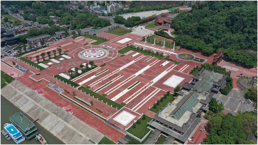 广场整体选用乐山市树海棠与高品质草皮,铺装采用铁锈红花岗岩与汉白玉雕刻,沿江设置音乐喷泉与水幕电影,营造兼具仪式感与游览趣味的景区门户空间。