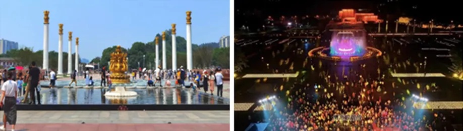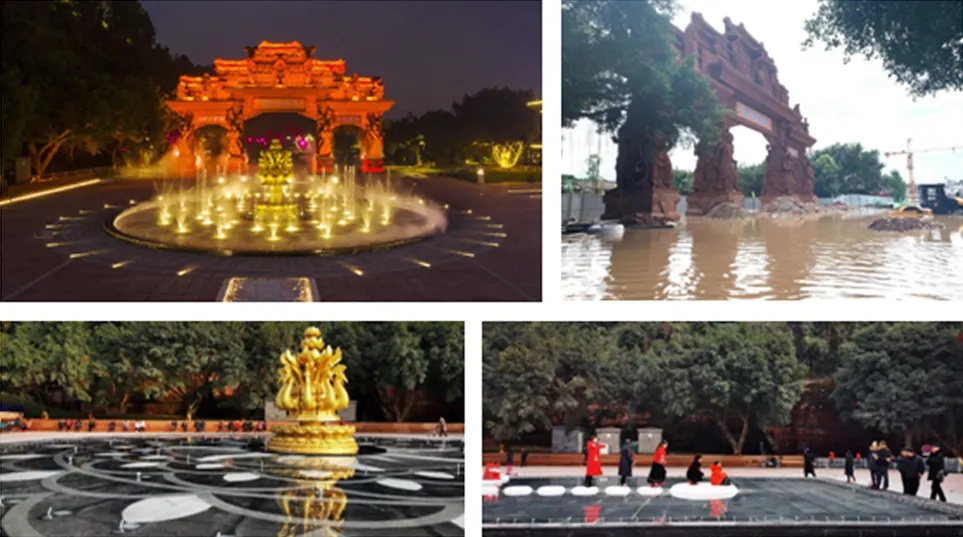 04 技术亮点项目运用3D打印技术对雕塑进行前期打样,确保造型精准。中心莲花音乐喷泉实现灯光、音乐、水形与机械联动;“九头孔雀喷泉”融合感应升降与游客互动,提升游览体验。施工过程中克服洪水、管线协同等挑战,保障最终效果。