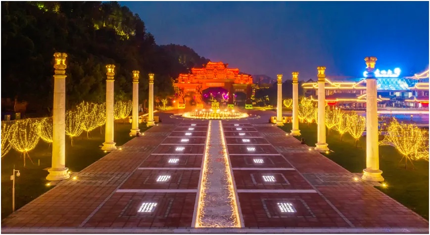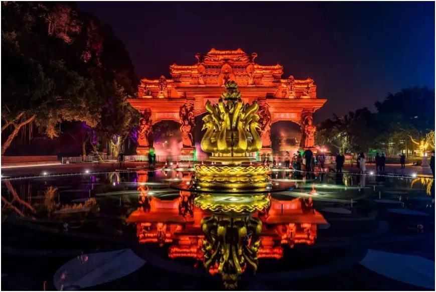 “九头孔雀喷泉”融合声光电与互动感应,寓意“七步生莲、吉星高照”,同时强化佛语长廊的起点意象。