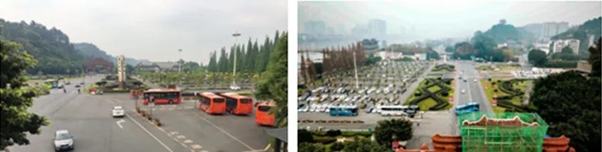 (一)文化广场广场东至博物馆、西至北码头、北至一号桥、南至北游客中心,面积约5万平方米。设计以东西、南北两条轴线组织空间:东西主轴以“乐山历史文化”为主题,南北次轴以“乐山大佛佛文化”为主题。