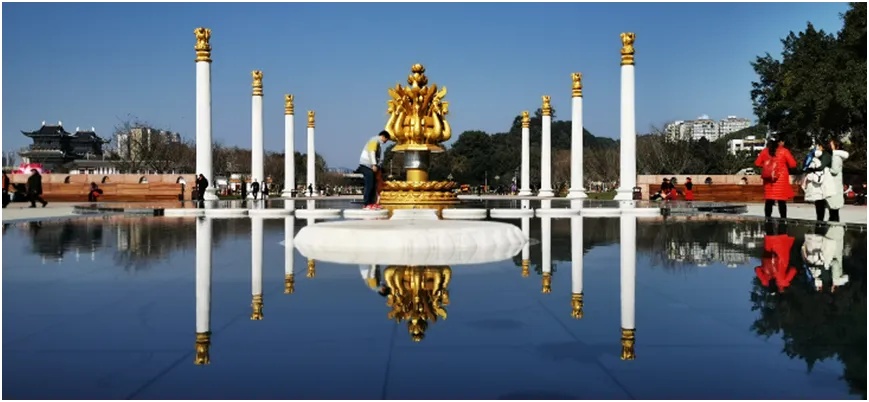 中心莲花喷泉象征凝聚与圆满,与周边四朵莲花共同形成“五莲”景观,寓意吉祥与升华。