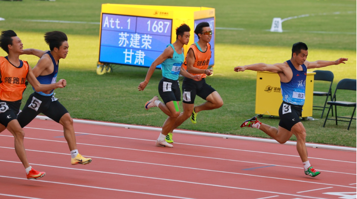 图为朱乾(左二)冲线时刻