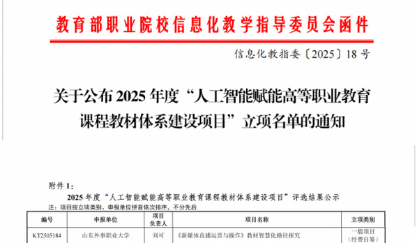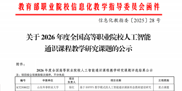 近日,教育部职业院校信息化教学指导委员会先后发布《关于公布2025年度“人工智能赋能高等职业教育课程教材体系建设项目”立项名单的通知》(信息化教指委〔2025〕18号)与《关于2026年度全国高等职业院校人工智能通识课程教学研究课题的公示》(信息化教指委〔2025〕28号)。其中,山东外事职业大学两项聚焦教材开发与创新的课题成功入选,充分彰显了学校在推动教学内容迭代升级、教材形态智能化转型方面的前瞻性战略布局,以及深厚扎实的教研攻坚实力。