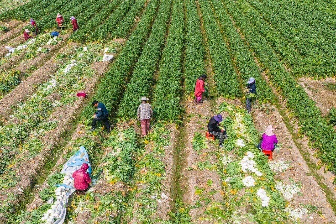 洋西村合作社大头菜种植地内,村民忙着采收大头菜。图片来源:海连江