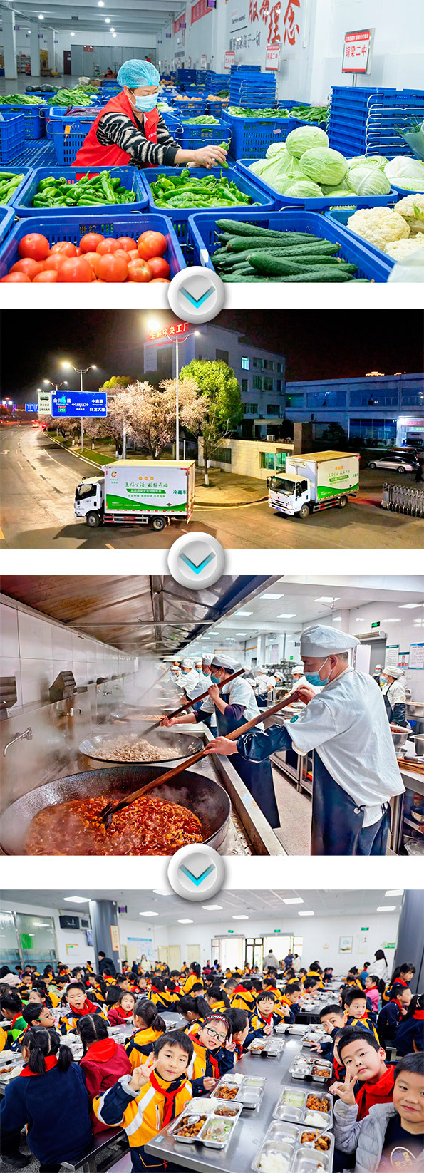 经过严格分拣、配送、制作,安全美味的饭菜端上了孩子们的餐桌。