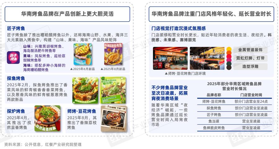 此外,近年来华南烤鱼品牌通过产品创新和门店年轻化策略构筑差异化竞争优势,精准触达年轻消费群体。在产品端口,品牌在口味研发和菜品创意上持续发力,不断尝试跨界融合、创新调味和特色食材应用,形成独特的产品卖点,以满足年轻消费者对新奇、多样化餐饮体验的追求。