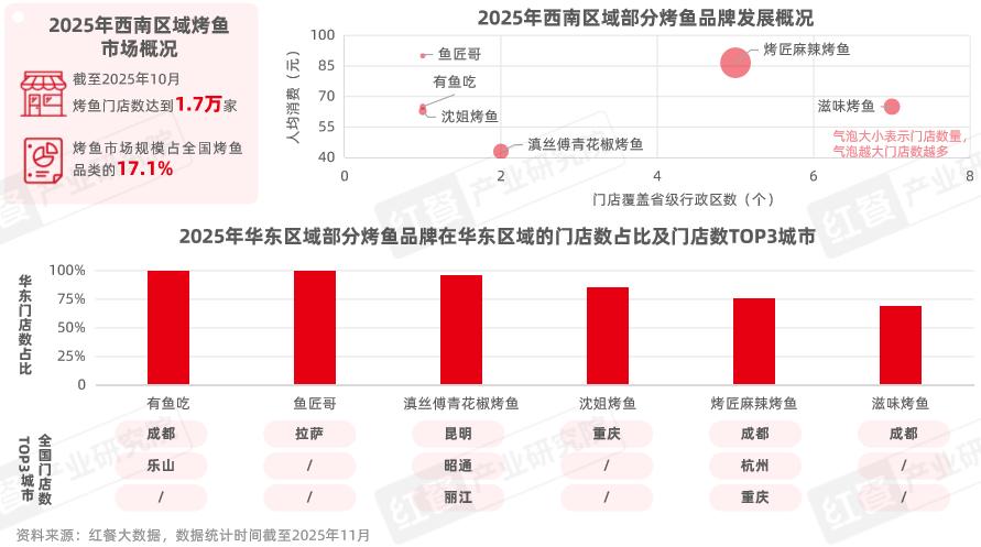 西南区域不仅是烤鱼的发源地,还是烤鱼品类的主要消费市场。据红餐大数据,西南区域的烤鱼市场份额占全国的17.1%,截至2025年10月,其烤鱼门店数达到1.7万家。