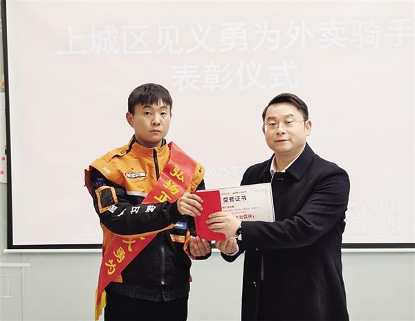 12月16日下午,杭州市见义勇为基金会在杭州市上城区新就业群体党群服务中心,向柴振朋授予“杭州市见义勇为积极分子”证书,并为他颁发10000元奖金。
