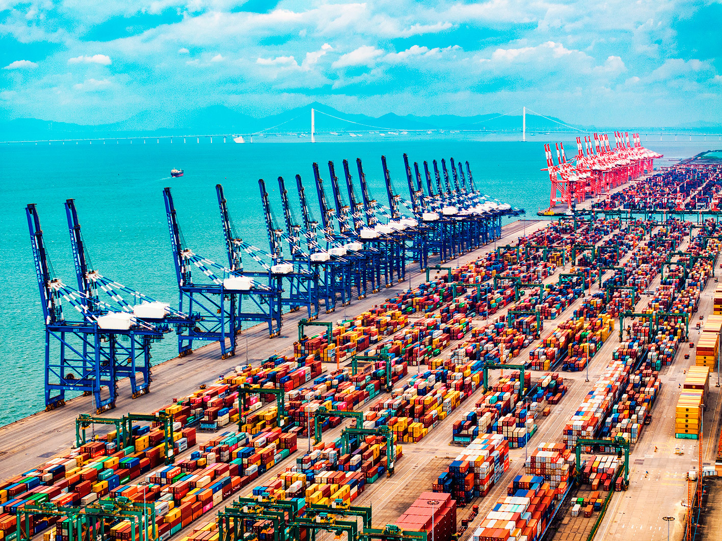 广州港南沙码头,大型集装箱货轮装卸作业,一派繁忙有序景象。