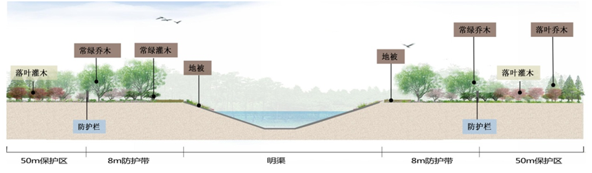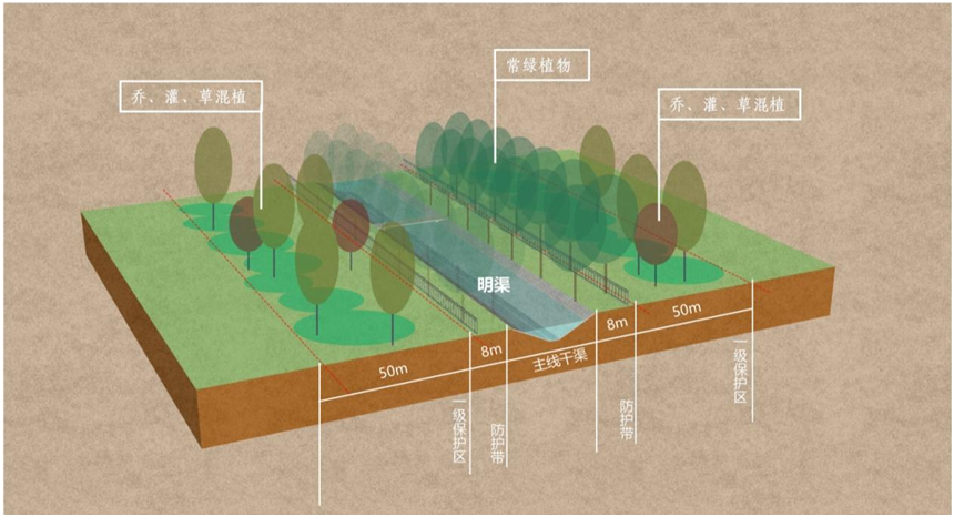 统筹考虑水土保持、水质安全、工程创面修复等生态需求,发展了基于GIS的多因子叠加分级评价方法,提出了以生态环境质量、景观格局状况和社会活动影响为核心的综合评价指 标体系,从传统水利设计转向整体空间设计,构建了沿线“地标性”植物群落的廊道模式,从传统水利设计转向整体空间设计,形成了山水人文相协调的“一带、四类、三核多点”近自然生态格局,打造了集景观、建筑和人文于一体的幸福长廊。