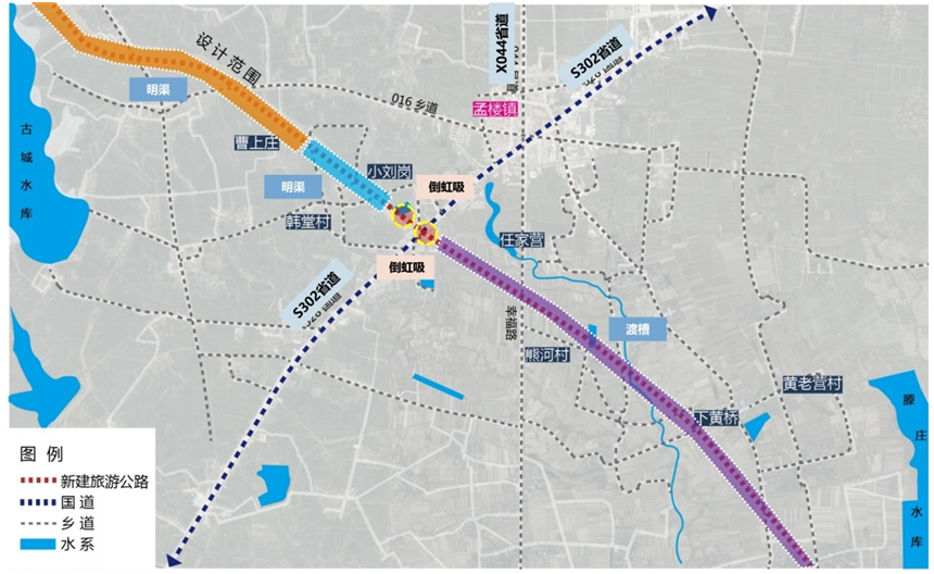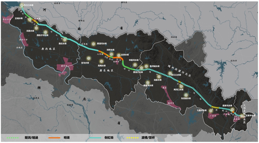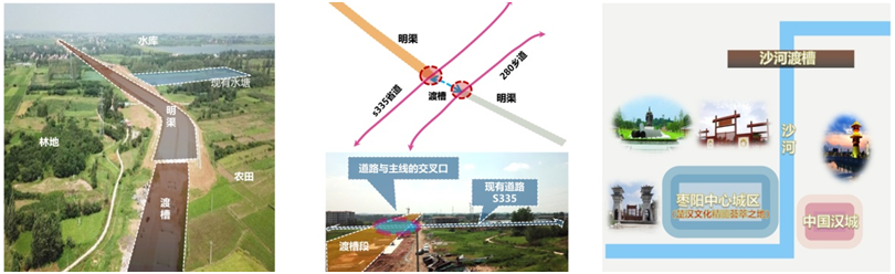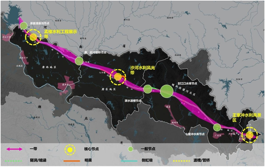 四类(四大工程类型):明渠、渡槽、水闸、暗涵三核(三大核心节点):孟楼水利工程展示带、沙河水利风光带、王家冲水利风景区多点:渠首节点、七里冲水库节点、封江口水库节点、唐白河管桥节点、㵐水渡槽节点(3)一带、四类