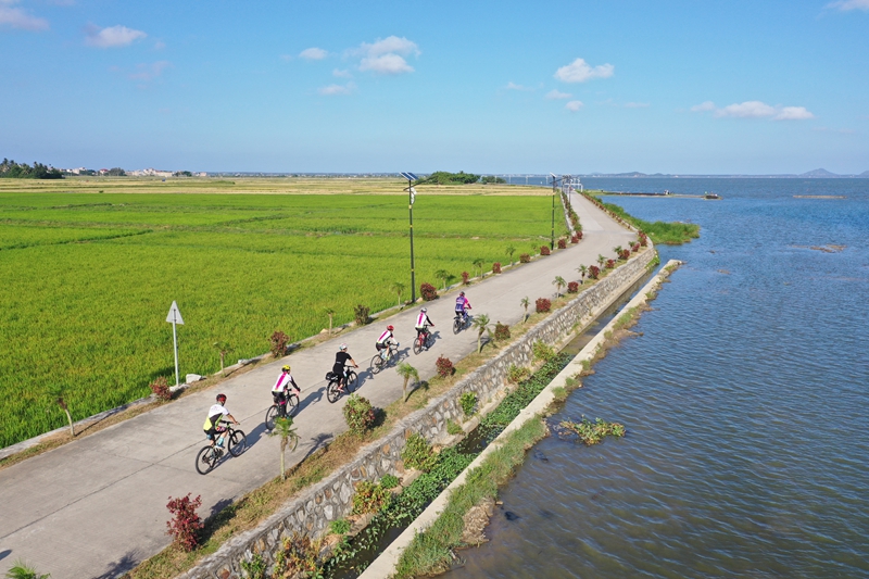 一群骑友在万宁小海边上骑行,沿线稻花飘香,丰收在望(杨师忠/摄 )