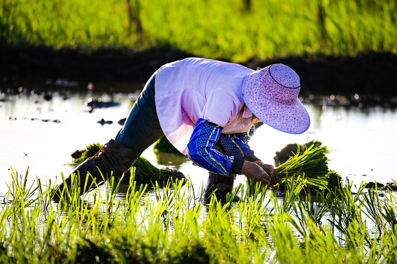 海水稻田里,村民正在插秧
