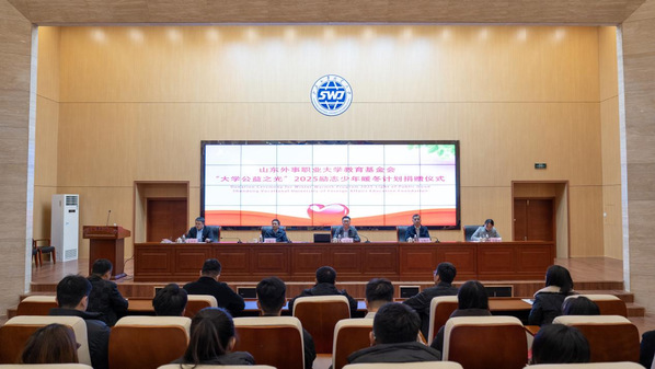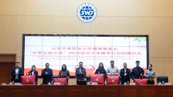 12月17日,山东外事职业大学教育基金会举行威海校区“大学公益之光”2025励志少年暖冬计划捐赠仪式。学校党委副书记、副校长李恒强,教育基金会副理事长李粤洋、副秘书长李船五,学生处、团委相关负责人出席活动。