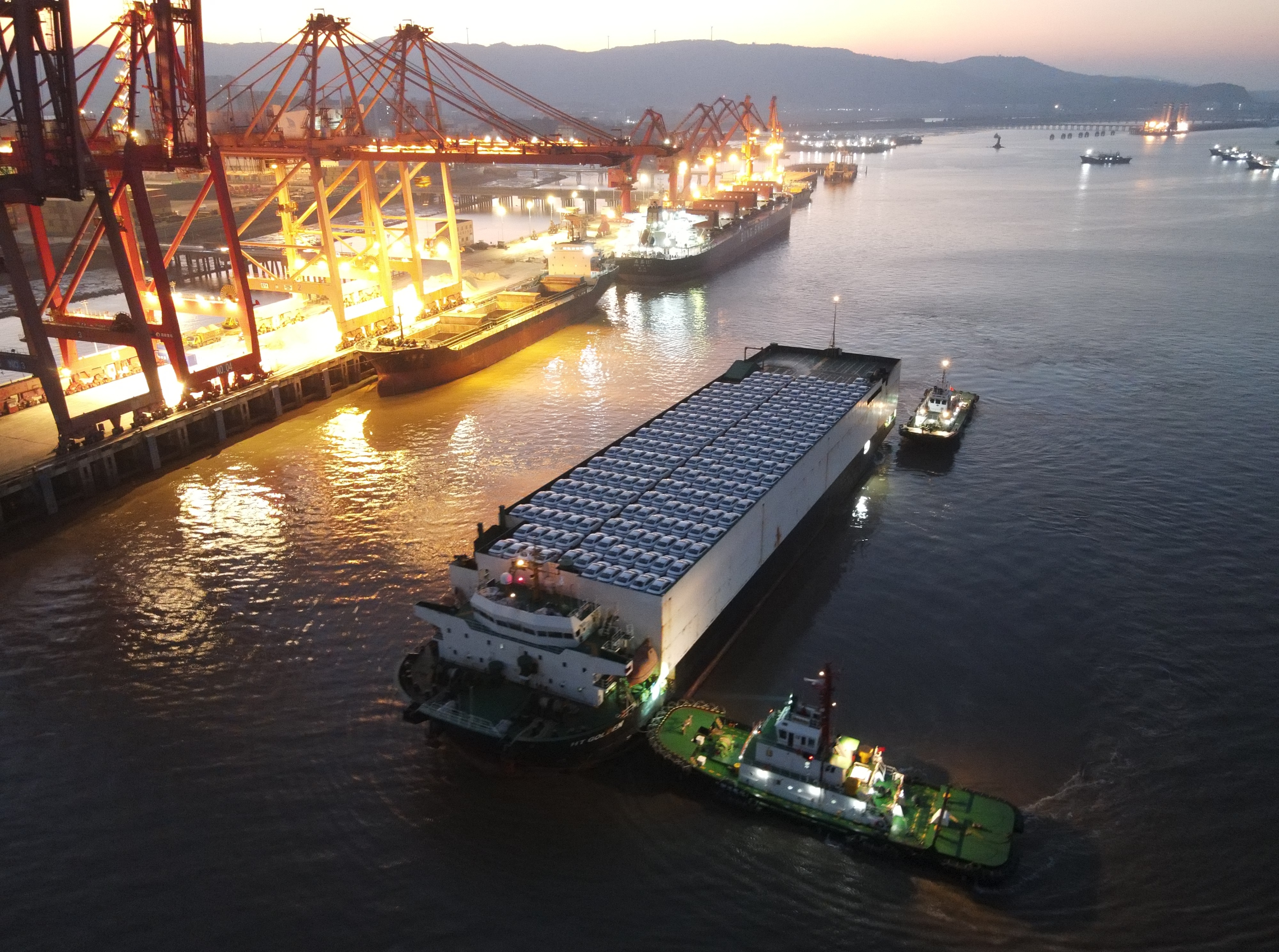 12月26日6时,巴拿马籍滚装船“海淘金”轮迎着初升的朝阳鸣笛进港,顺利抵达台州港大麦屿港区。该轮在台州装载800余辆二手汽车后,将离港驶向迪拜杰贝阿里港。这是台州二手车首次从本地港口实现滚装直航出口。