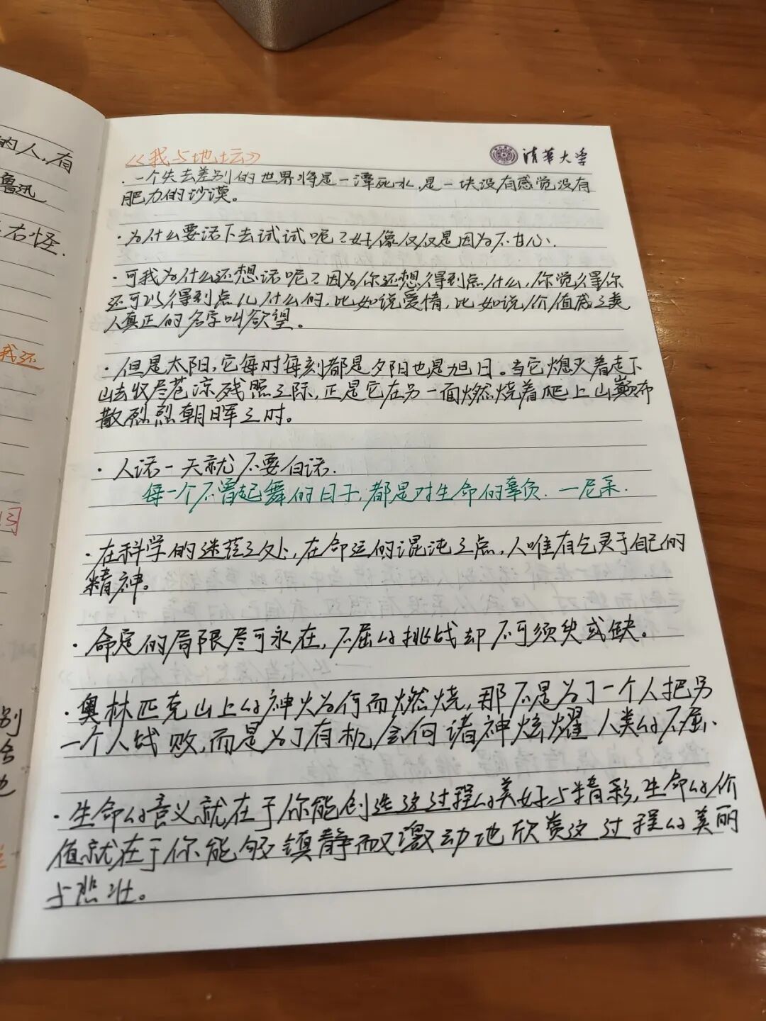 上高中前,我想着买本清华的本子勉励自己积累作文素材,如今真的坚持下来了。在阅读后、思考后,留下自己的痕迹。