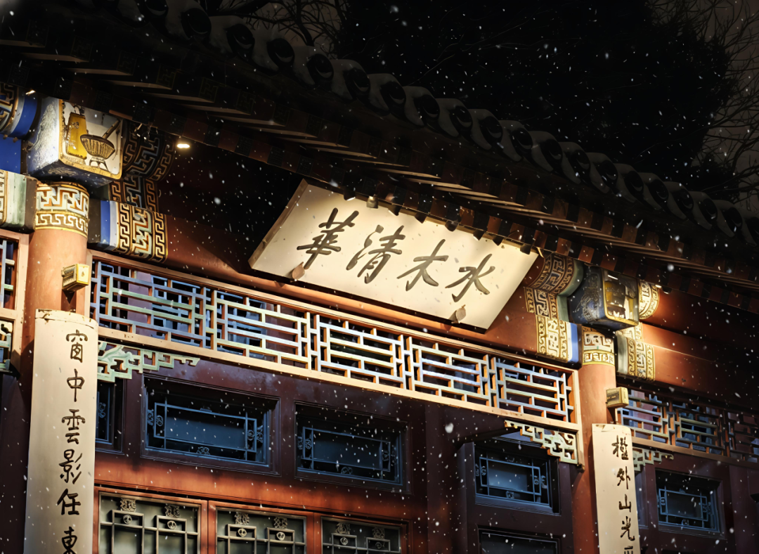 初雪静落,在水木清华前偶然驻足。夜色如墨,灯火却将古朴的匾额温暖照亮。寒风凛冽,这里却有着冬日最深的沉淀与宁静。于万物收束的时节,在此刻收藏这一份厚重与明亮,静待来年春华。