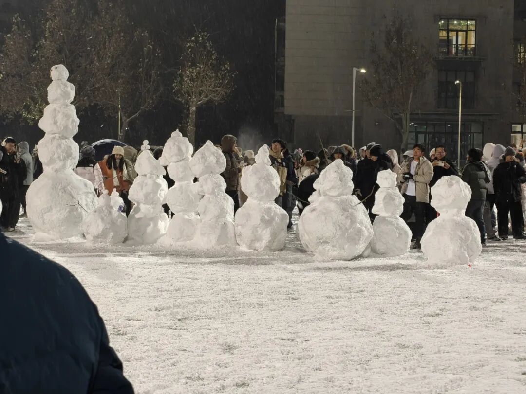 北京初雪,清华紫操上形态各异的“雪人大队”。