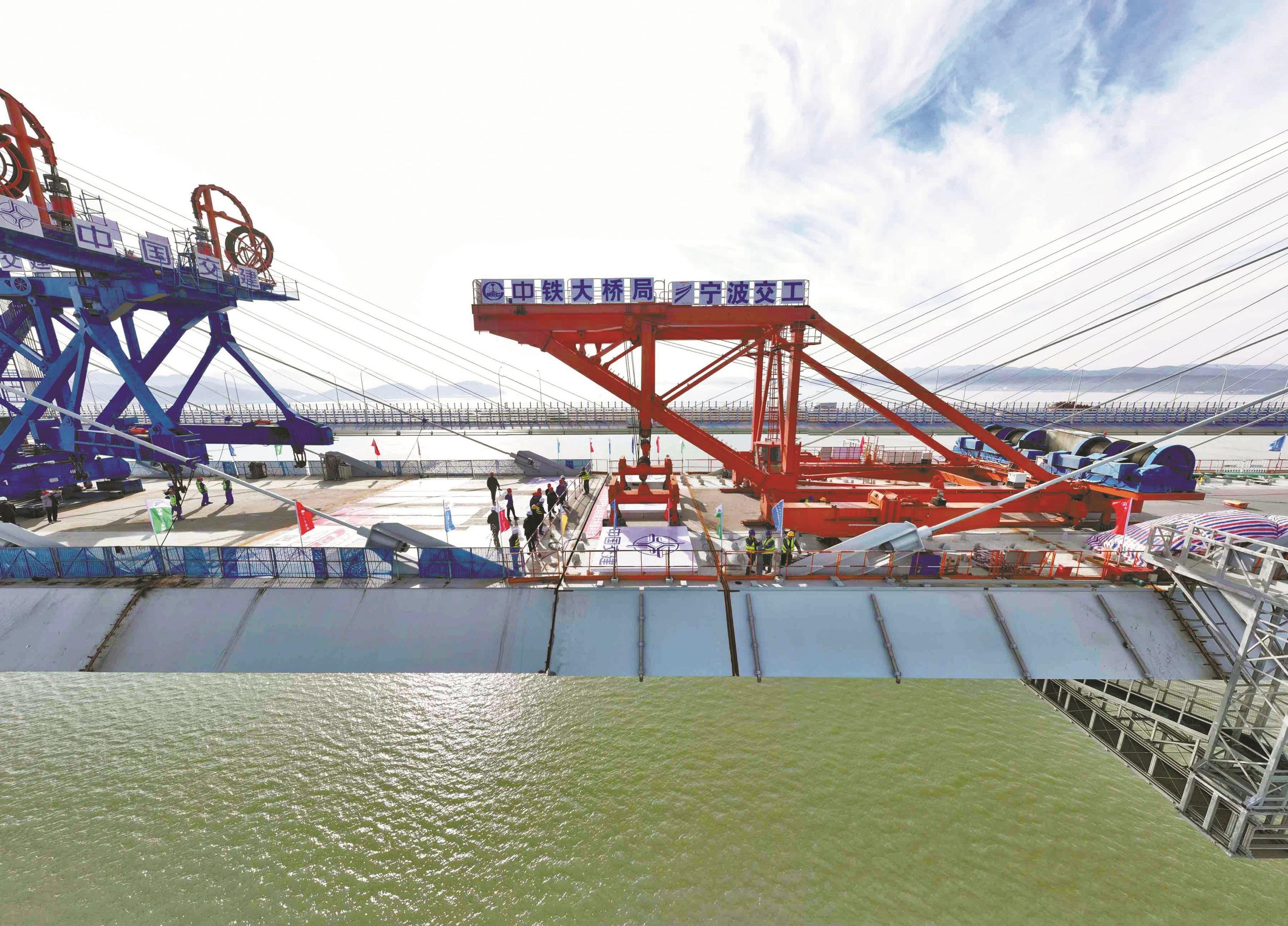 12月29日15:15,随着最后一片钢箱梁精准吊装到位,国内首座市域(郊)铁路跨海大桥——宁波市域铁路象山港跨海大桥(以下简称“象山港跨海铁路大桥”)顺利合龙。该桥全长8.276公里,是国内紧邻既有桥最大跨径桥梁,也是世界上最大跨径无砟轨道铁路斜拉桥。