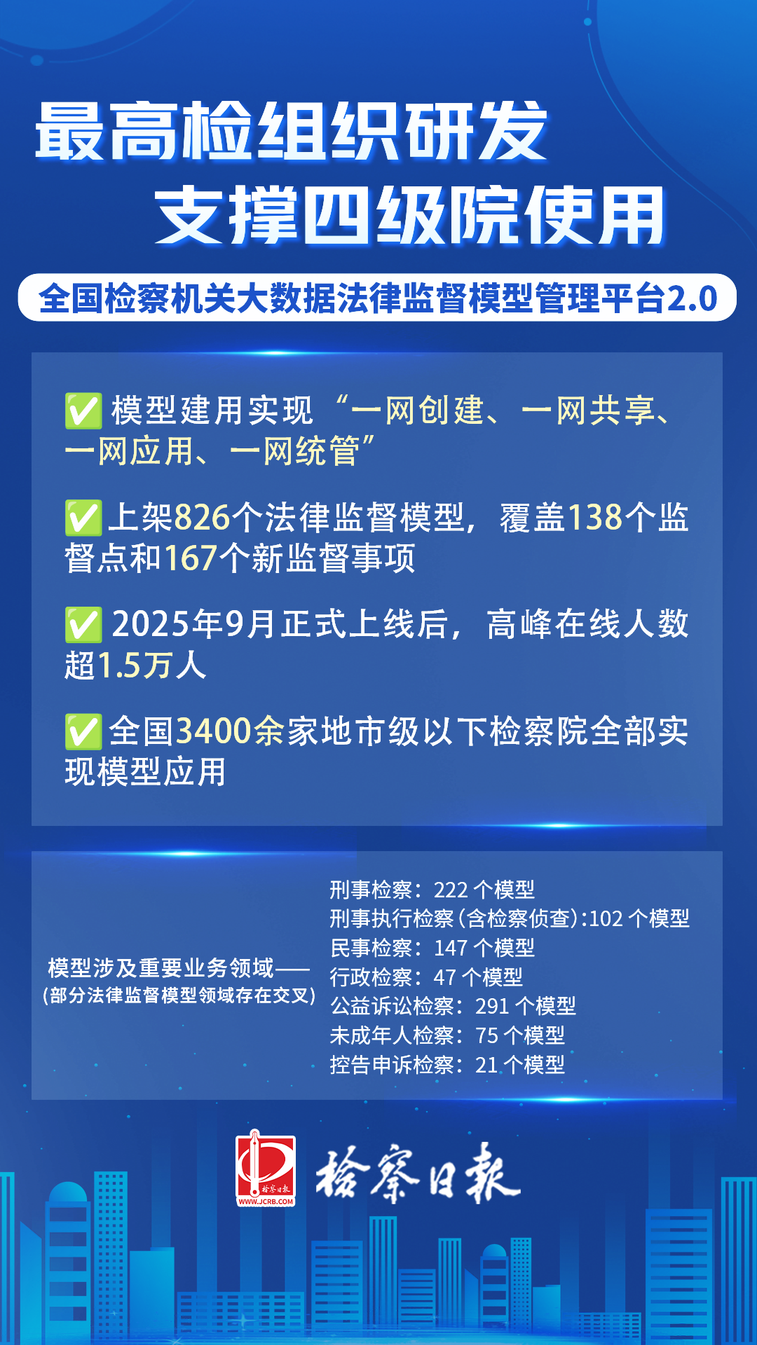 据了解,2025年,最高人民检察院在模型管理平台1.0的基础上,组织研发建设了支撑四级检察院使用的模型管理平台2.0(下称“2.0平台”),模型建用实现“一网创建、一网共享、一网应用、一网统管”。目前,826个模型在平台上架,全面涵盖“四大检察”不同业务场景的138个监督点与167个新监督事项。本次竞赛活动中,全国检察机关有957家完成一级监督场景应用全覆盖,577家完成二级监督场景应用全覆盖,227家完成重点监督点应用全覆盖,2.0平台高峰在线人数超过1.5万人。
