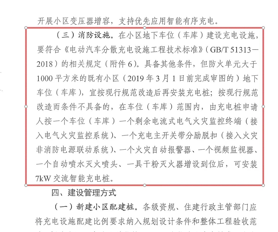根据《湘潭市居民区电动汽车充电设施建设工作方案》,对于地下车位(车库)的改造,也并不是像小区物业说的只要求消防栓这么简单。方案明确:按现行规范改造而条件不具备的,在车位(车库)范围内,由充电桩申请人按一个车位(车库)一个剩余电流式电气火灾监控终端(接入电气火灾监控系统)、一个充电主开关带分励脱扣(接入火灾非消防电源联动系统)、一个火灾自动报警器、一个视频监视器、一个自动喷水灭火喷头、一具干粉灭火器增设到位后,可以安装7kW交流智能充电桩。