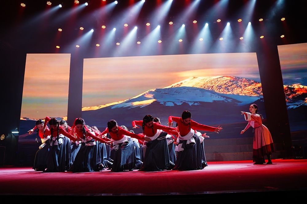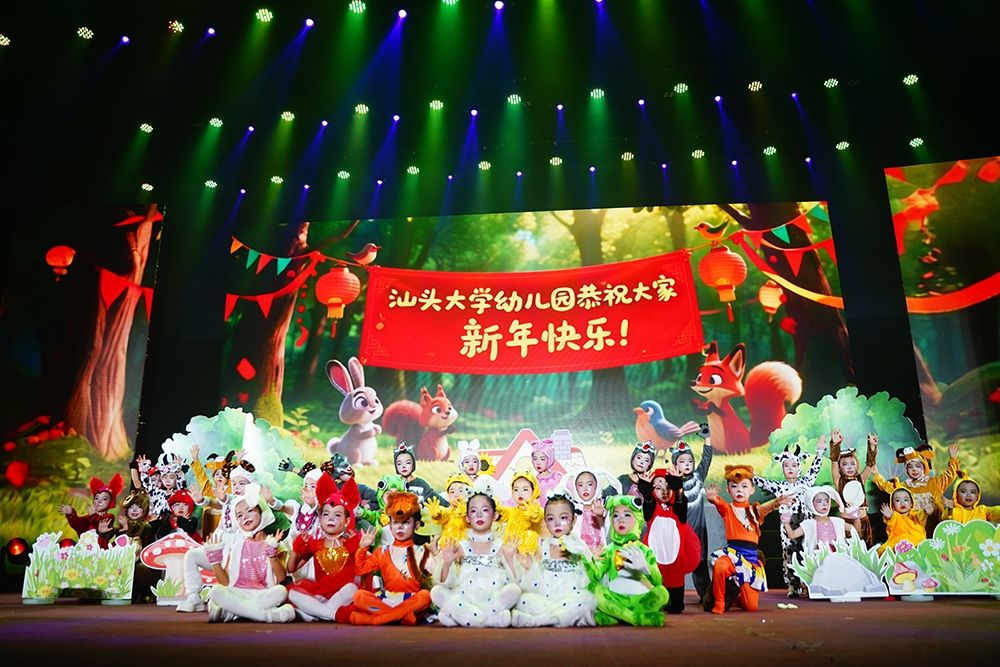 演出环节精彩纷呈,节目形式丰富多样,涵盖管乐合奏、舞蹈、合唱、儿童剧、器乐演奏、武术、潮剧旗袍秀、街舞等多个类别,汇聚了全校各学院、社团及师生代表的精心编排。汕头大学管乐团率先登场,以慷慨激昂的《钢铁洪流进行曲》点燃全场激情,随后又带来充满活力的《普罗旺斯之风》,用悠扬乐声传递新年期盼;舞蹈《唱支山歌给党听》深情再现了藏族同胞在党的光辉下重获新生的感人历程,舞姿深情而震撼;数学与计算机学院“和声”流行音乐合唱营的学子们放下键盘与公式,以《看得最远的地方》唱出他们对青春的坚定向往;汕头大学幼儿园小朋友们带来的儿童剧《小灰狼的烦恼》童趣盎然,传递了真诚与友谊的美好。