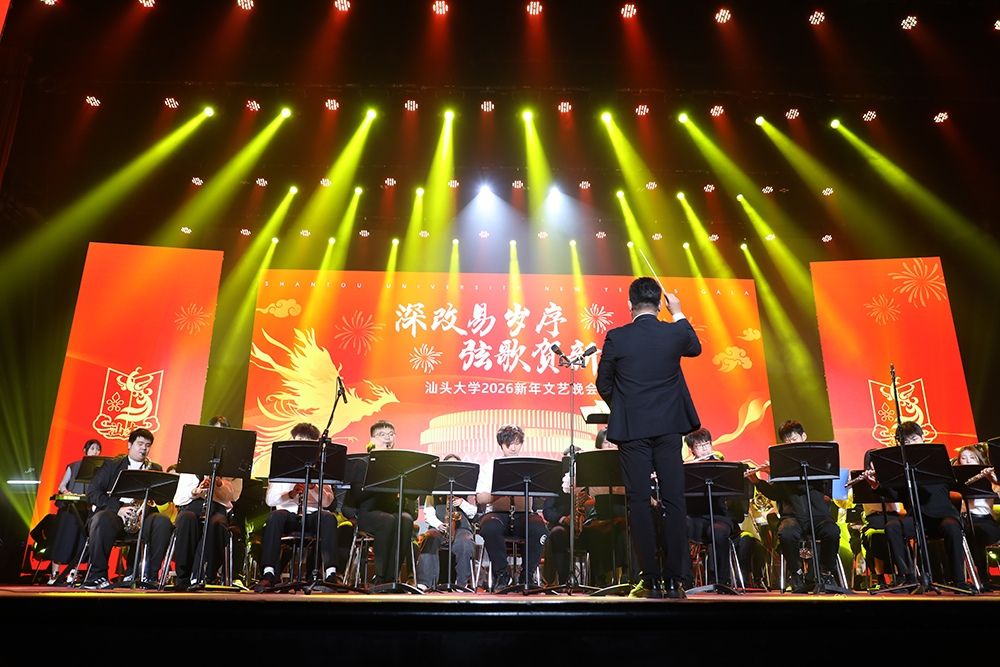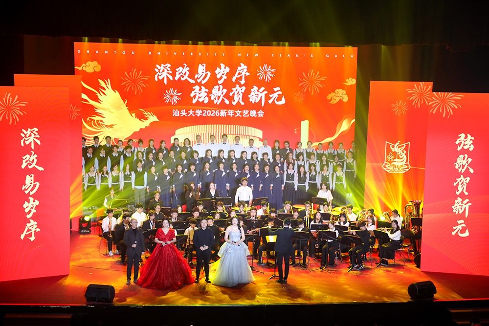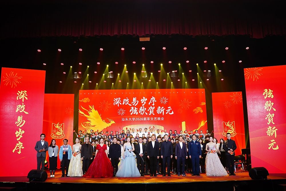 律回春晖渐,万象启新元。12月26日,大礼堂灯火璀璨、暖意融融,“深改易岁序,弦歌贺新元”2026新年文艺晚会在此举行。校党委书记唐锐,党委副书记周镇松,党委常委、副校长喻洪,睦邻友好单位嘉宾、中国人民解放军某部政治工作部主任马军上校等莅临晚会现场。全校师生齐聚一堂,通过精彩的视听盛宴告别硕果累累的2025年,共同迎接充满希望的2026年。本次晚会通过“汕头大学”官方视频号及校内网络电视同步全程直播,让未能到场的观众也能共享这份喜悦与荣光。