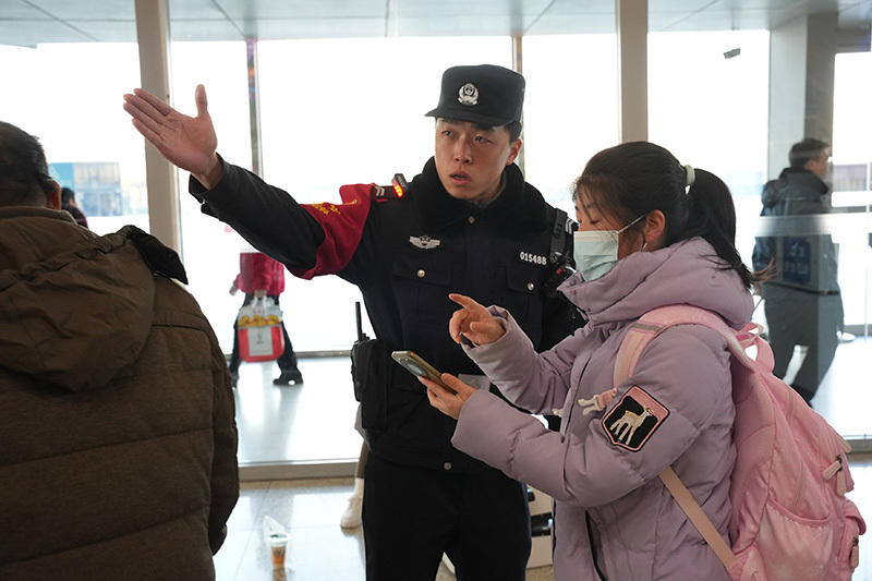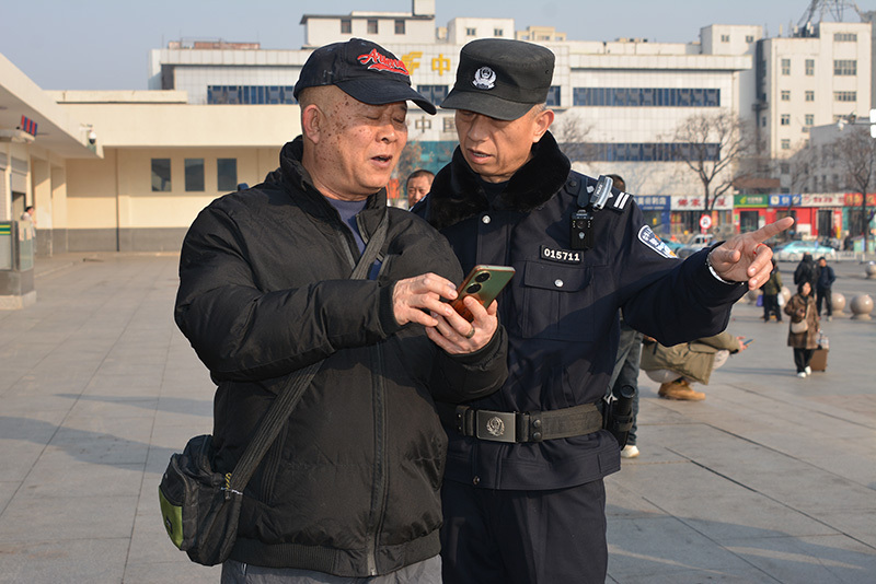 ▲石家庄站派出所民警在客流高峰期为旅客解答疑问。秦文辉/摄