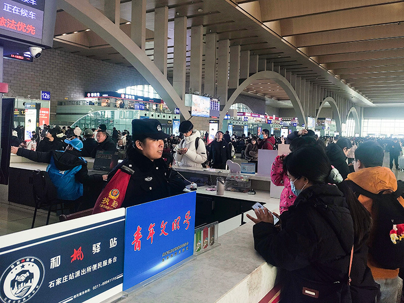 ▲石家庄站派出所民警为民服务。