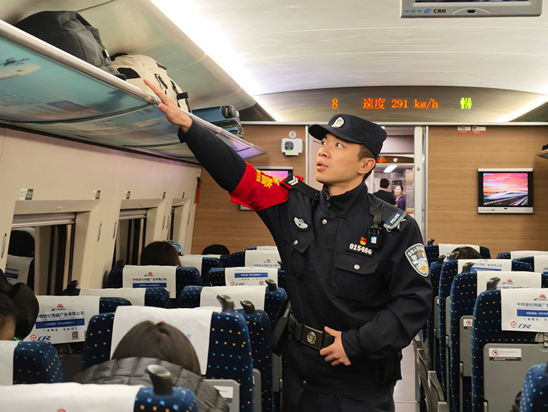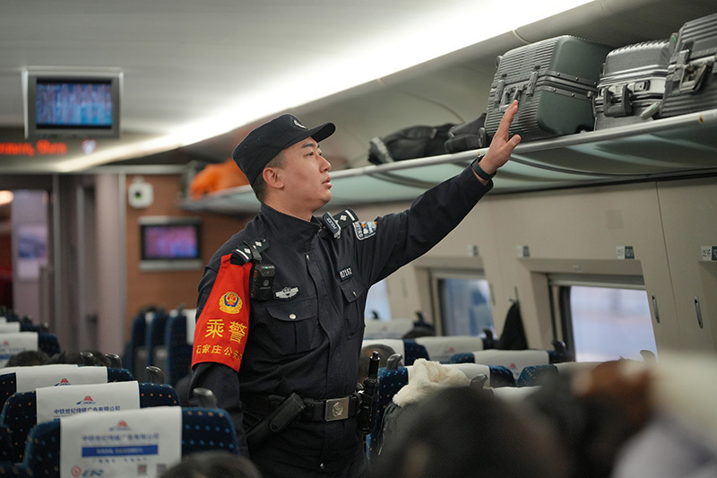 ▲乘警支队民警在高铁车厢进行安全巡视。