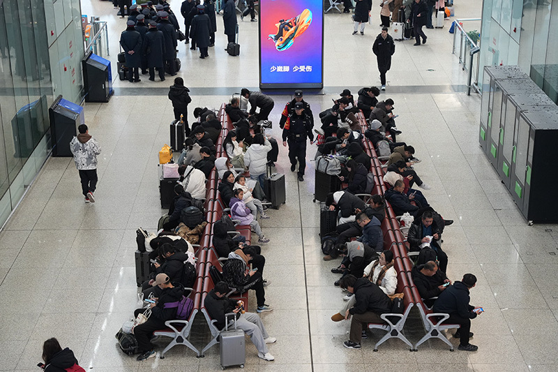 ▲石家庄站派出所民警在候车室进行巡逻巡视。