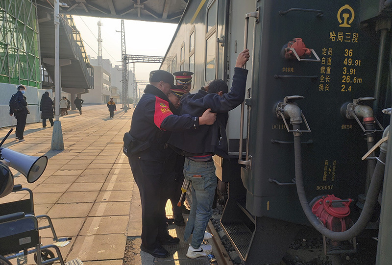 ▲高碑店站派出所民警帮扶旅客上车。