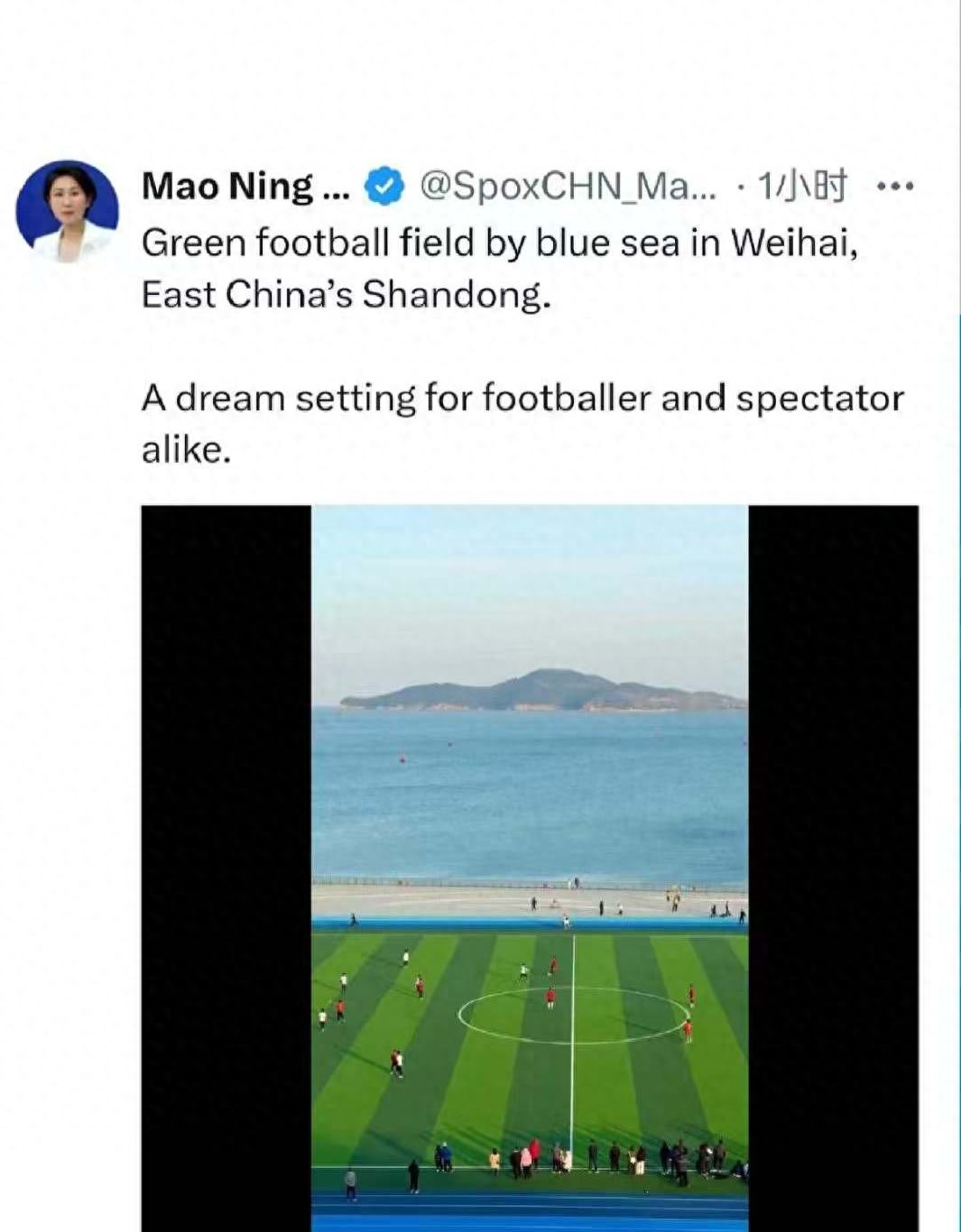 1月4日,外交部发言人毛宁在海外社交平台发文:中国山东威海,碧海之畔的绿茵赛场,令球员与观众心驰神往。