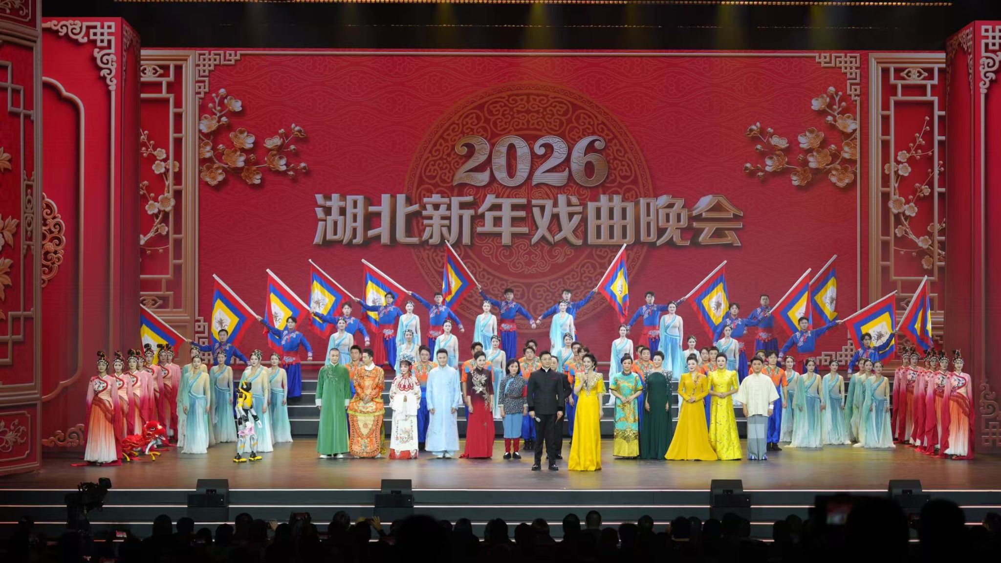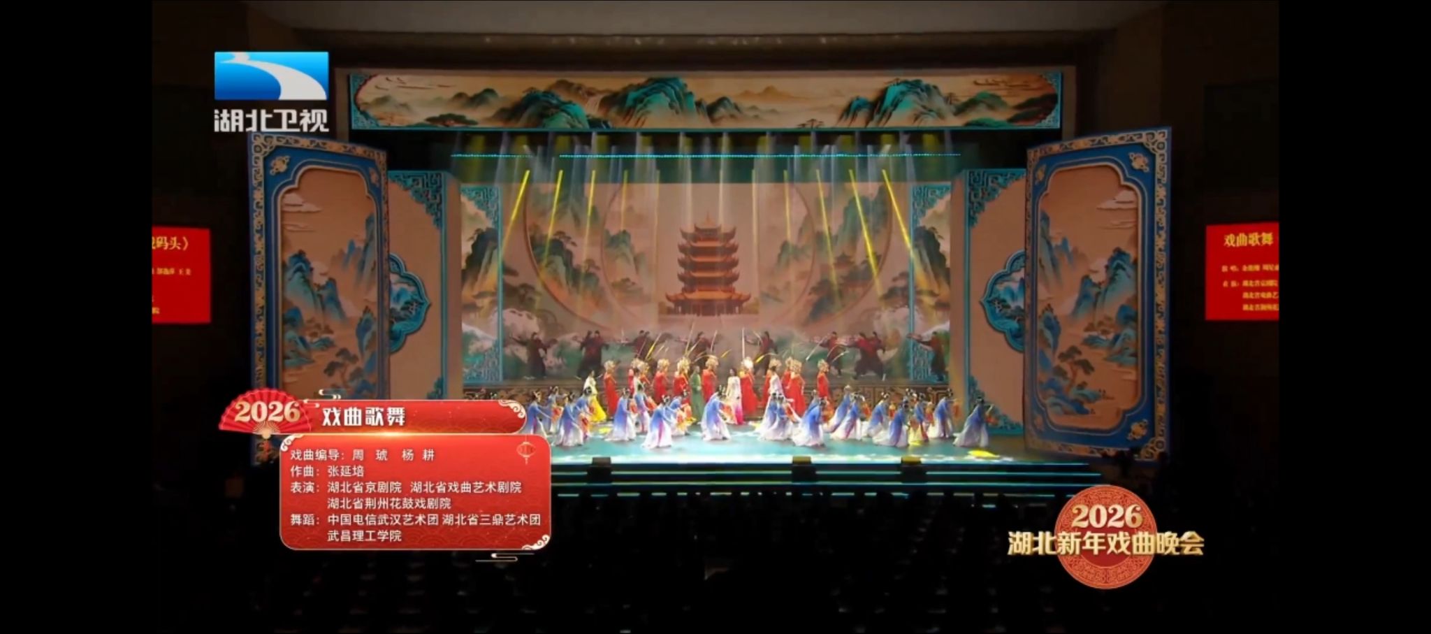 《2026湖北新年戏曲晚会》由中共湖北省委宣传部、湖北省文化和旅游厅、湖北广播电视台、湖北省文学艺术界联合会联合主办,以“守正创新、戏韵长江”为主题,通过“戏曲+科技”“传统+时尚”的多元融合,为观众呈现了一场跨越时空、连接古今的戏曲艺术盛宴,生动展现了湖北振兴戏曲“大码头”、建设长江文化高地的丰硕成果。
