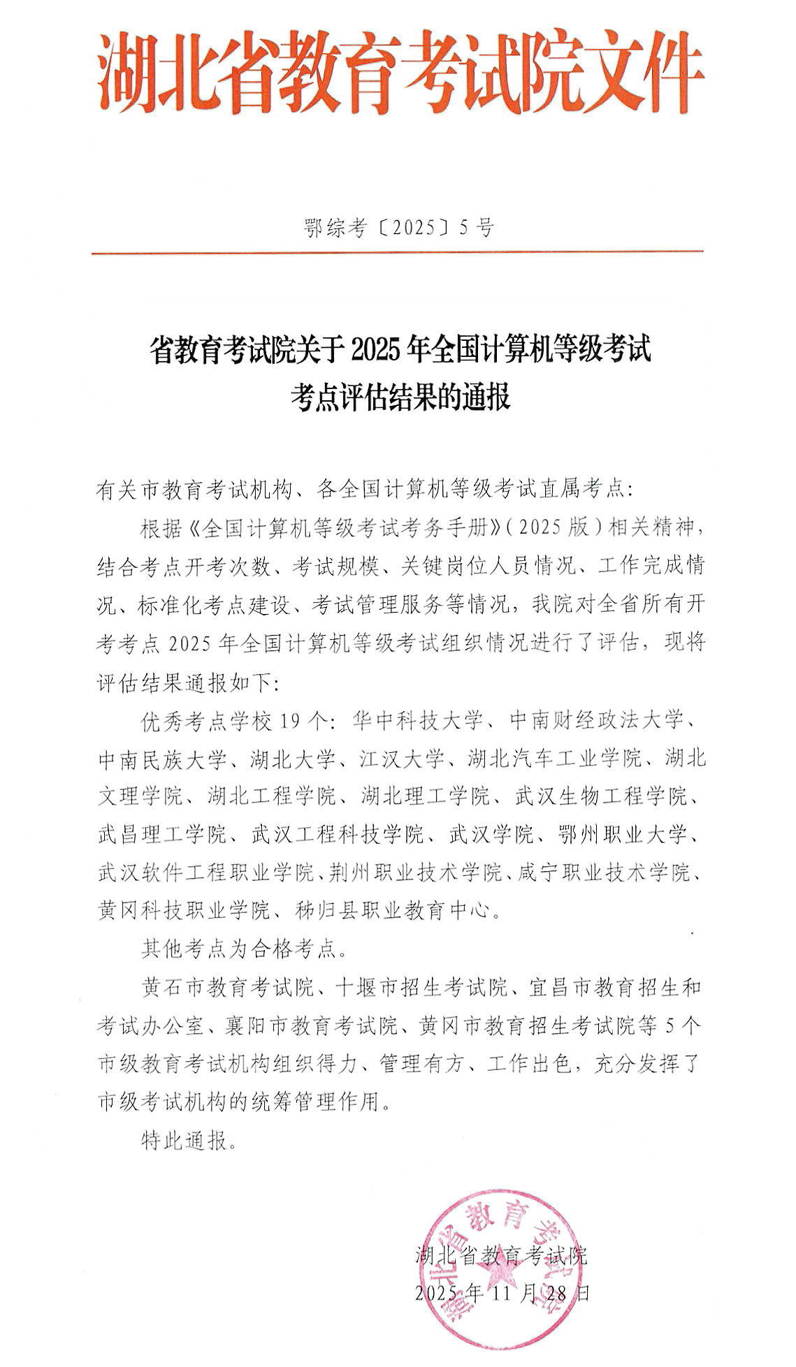 近日,湖北省教育考试院公布2025年全国计算机等级考试(NCRE)考点评估结果,武昌理工学院成功获评“优秀考点”。