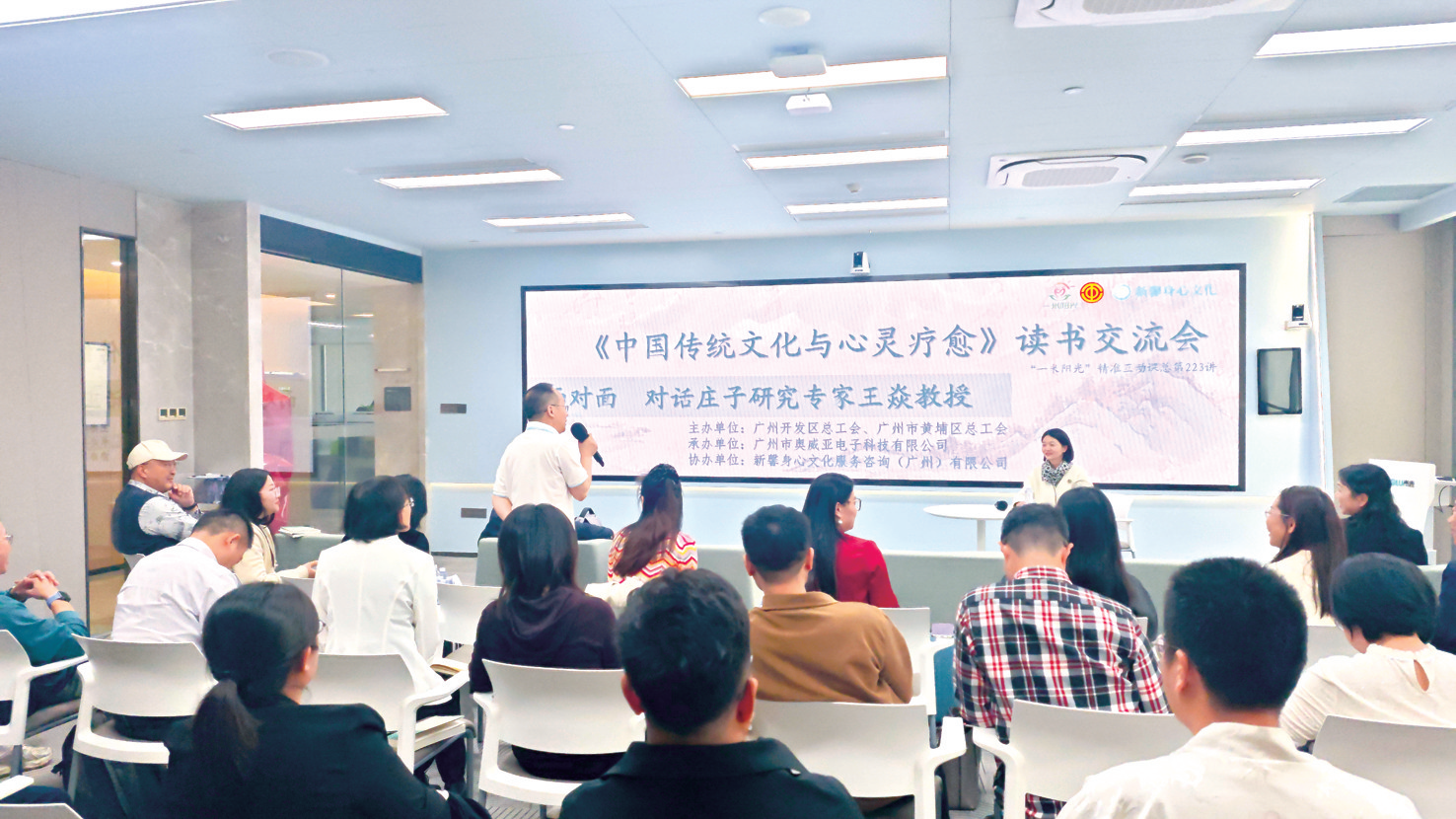 近日,在广州市黄埔区奥威亚多功能展厅,一场围绕古籍智慧与现代心灵疗愈的对话,为黄埔职工打开了一扇心灵之窗。由广州开发区总工会、广州市黄埔区总工会(以下简称“黄埔区总工会”)主办的“《中国传统文化与心灵疗愈》——面对面对话庄子研究专家王焱教授”主题读书交流活动在此举办,来自黄埔区传统根文化工作室的职工代表与《中国传统文化与心灵疗愈》作者、广东外语外贸大学教授、广东省国学学会会长王焱分享读书心得,并畅谈自己在家庭教育、自我成长中的现实困惑。