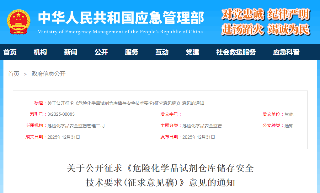 为进一步加强危险化学品生产经营企业危险化学品试剂仓库储存安全管理,应急管理部危化监管二司组织编制了《危险化学品试剂仓库储存安全技术要求(征求意见稿)》,现向社会公开征求意见。